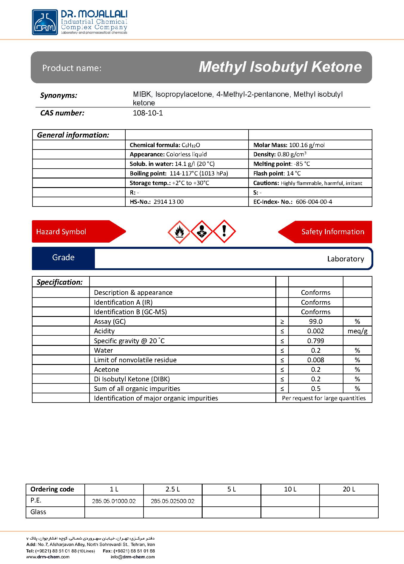 | مترادفها : MIBK, Isopropylacetone, 4-Methyl-2-pentanone, Methyl isobutyl ketone |