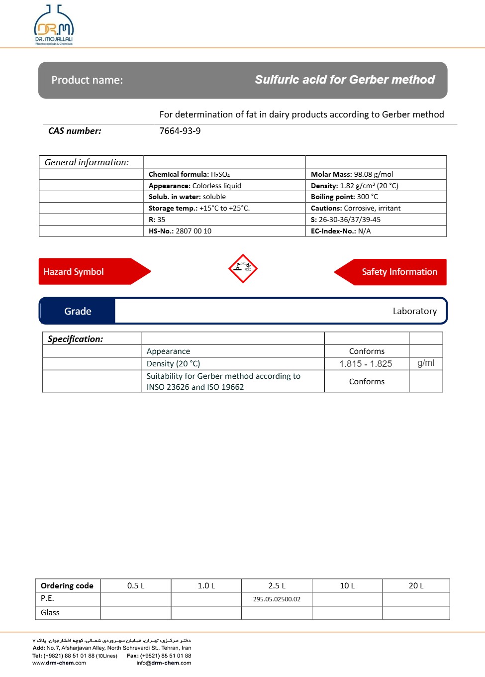 برند دکتر مجللی اسید سولفوریک ژربر با خلوص ۹۰ تا ۹۱ درصد را با غلظتی دقیق و کیفیت بالا عرضه میکند. دقیق بودن غلظت آن یک عامل مهم در تعیین چربی و اجزای آلی شیر بوده تا نتایج قابل اعتماد در آزمایشگاههای کنترل کیفیت تضمین شود. نداشتن غلظت دقیق میتواند چربی را بسوزاند، کربونیزه کند و یا پروتئینها کامل حل نشوند. برند دکتر مجللی سولفوریک اسیدی عاری از فلزات سنگین، مواد آلی و سایر ناخالصیها طبق استانداردهای INSO 23626 و ISO 19662 به مشتریان ارائه می کند.