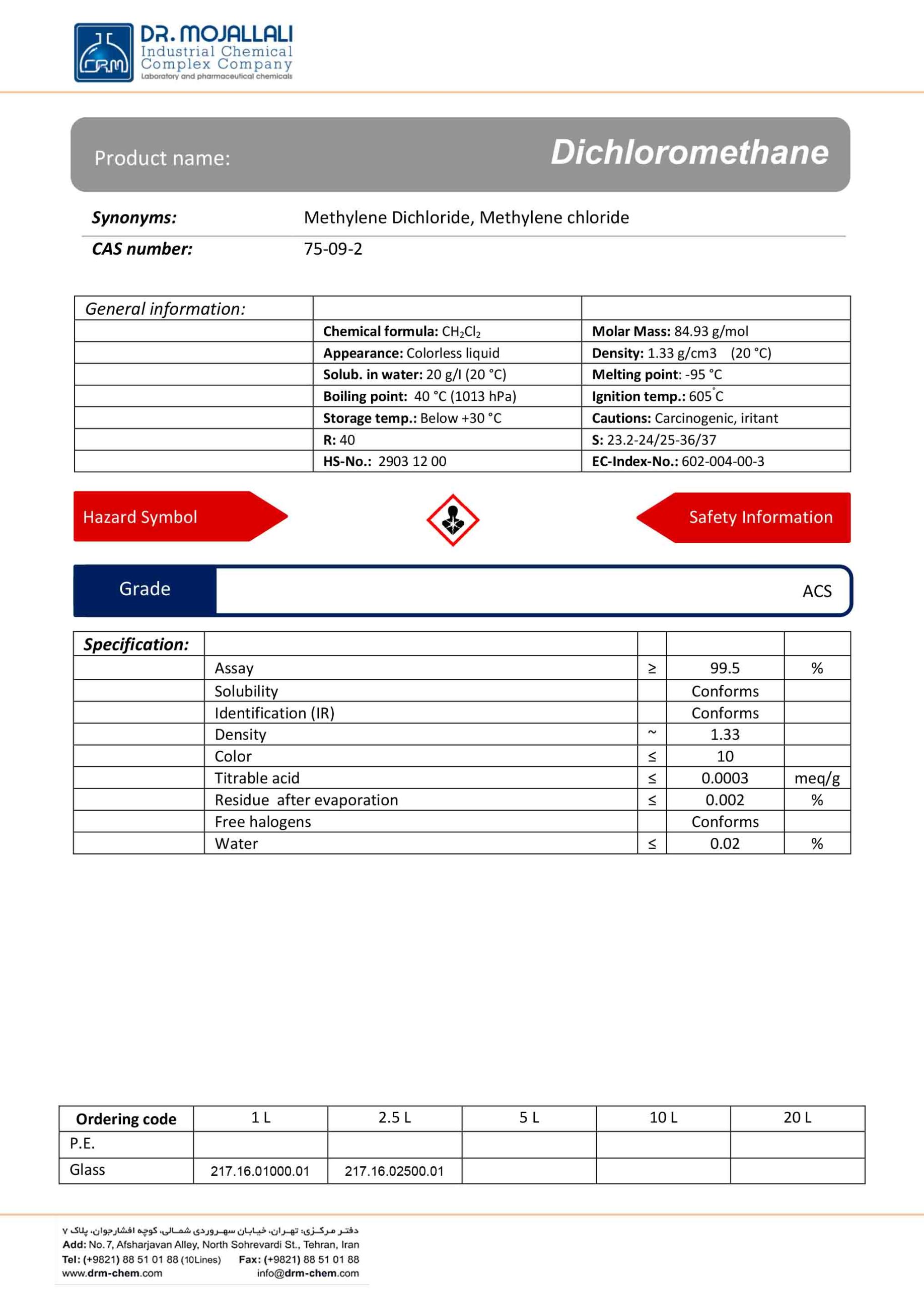 دکتر مجللی از شرکت های مشهور و معتبر در تولید ترکیبات و مواد شیمیایی، این حلال قوی و پایدار را با کیفیت بالا و در گریدهای گوناگون ارائه میکند. دیکلرومتان گرید ACS یکی از محصولات با کیفیت این برند است. دکتر مجللی با تکیه بر فناوریهای پیشرفته و استانداردهای بینالمللی، محصولات خود را به مشتریان ارائه و نیازهای آزمایشگاهها و صنایع داخلی را برطرف میکند. استانداردهای GMP (Good Manufacturing Practice) و ISO از جمله استانداردهای به کار گرفته شده در تولید مواد شیمیایی در شرکت دکتر مجللی است.