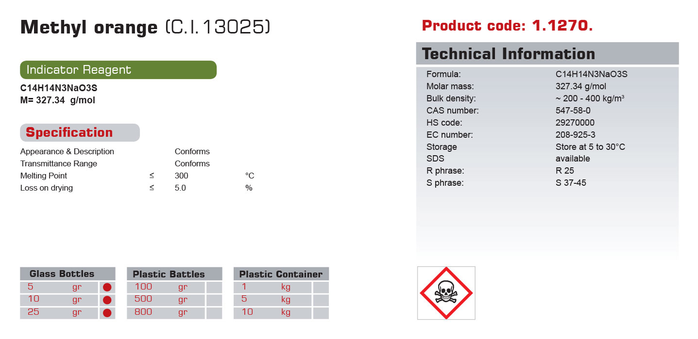 فروشگاه تمادکالا عرضهکننده مواد شیمیایی آزمایشگاهی و صنعتی، مفتخر است انواع شناساگرها و معرفهای شیمیایی را با کیفیتی تضمین شده و قیمتی مناسب به تمامی خریداران در سراسر کشور تحویل نماید. شما میتوانید هماکنون برای خرید شناساگر متیل اورانژ از طریق همین صفحه اقدام به ثبت سفارش فرمایید. درصورت وجود هرگونه مشکلی در روند ثبت سفارش و خرید کالا، از طریق شمارههای درجشده درسایت، با کارشناسان ما تماس حاصل فرمایید.