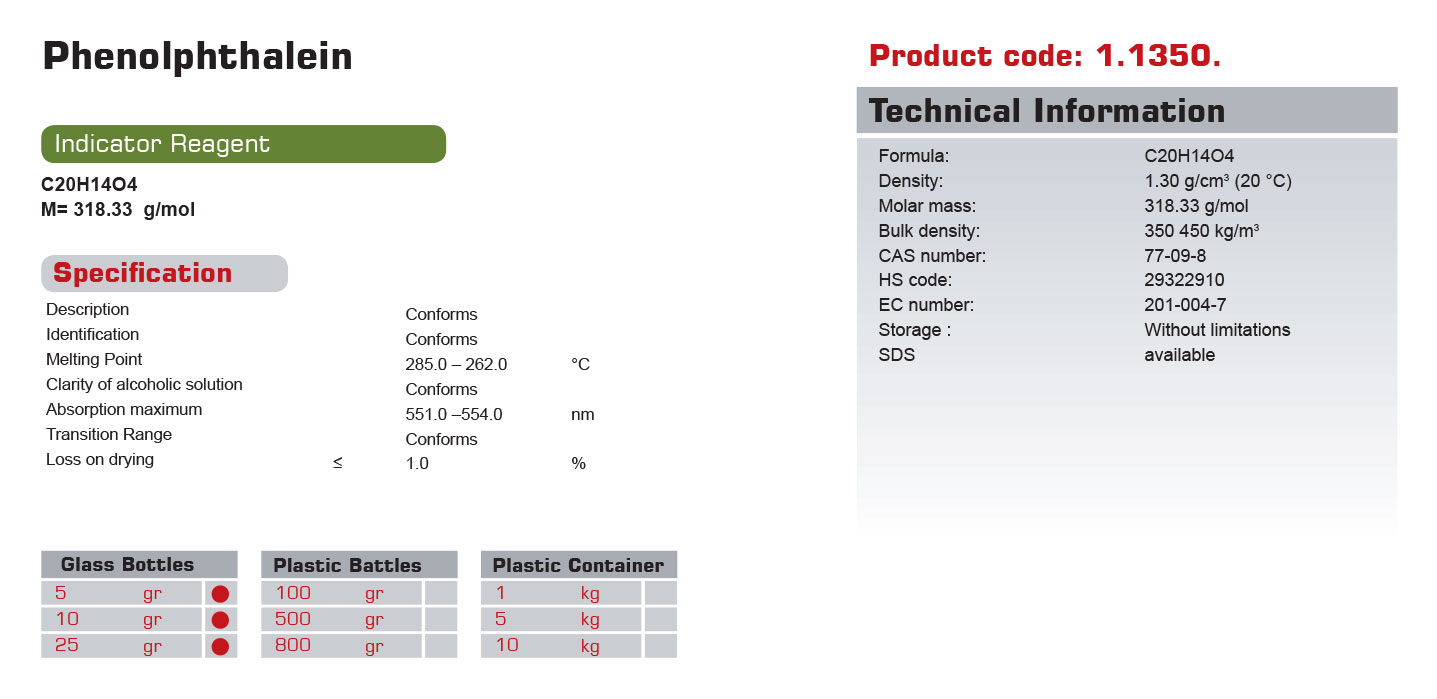شناساگر فنل فتالئین با فرمول شیمیایی C20H14O4 یک شناساگر pH است که در گذشته به عنوان ملین مورده استفاده قرار می گرفت.آزمایشگاه ها مورد استفاده قرار می گیرد. این شناساگر ظاهری پودری داشته که در آب به خوبی حل نمی شود.