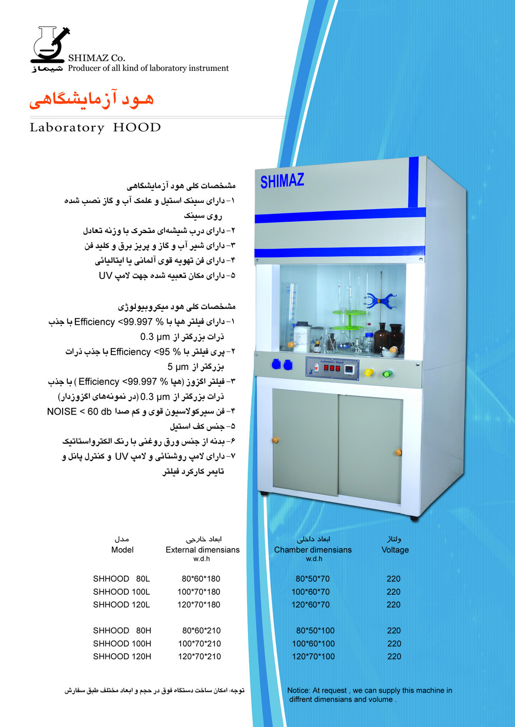 هود یکی از اصلی ترین تجهیزات هر آزمایشگاهی است که به هنگام انجام آزمایش و یا حفاظت و نگهداری از نمونه ها از آن استفاده می شود. هود آزمایشگاهی اتاقکی از جنس استیل بوده و جلوی آن شیشه ای به طور عمودی قرار دارد. این شیشه به دلیل آن که به آسانی پایین و بالا می شود این امکان را فراهم می کند تا کاربرد زمانی که دستانش داخل محفظه است، بتواند مراحل آزمایش را از پشت شیشه مشاهده نمایید.