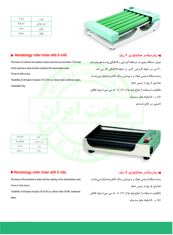 یکی از تجهیزات ضروری آزمایشگاه های هماتولوژی، دستگاه رول میکسر است. این دستگاه با حرکات چرخشی باعث همگن نگهداشتن محتویات خون لوله CBC، نمونه های ویسکوز و سوسپانسیون ها می شود. نحوه استفاده از این دستگاه به این صورت است که پس از اتصال کابل برق دستگاه و قرار دادن لوله ها بر روی رولر، با روشن کردن کلید ON دستگاه شروع به چرخش می کند.