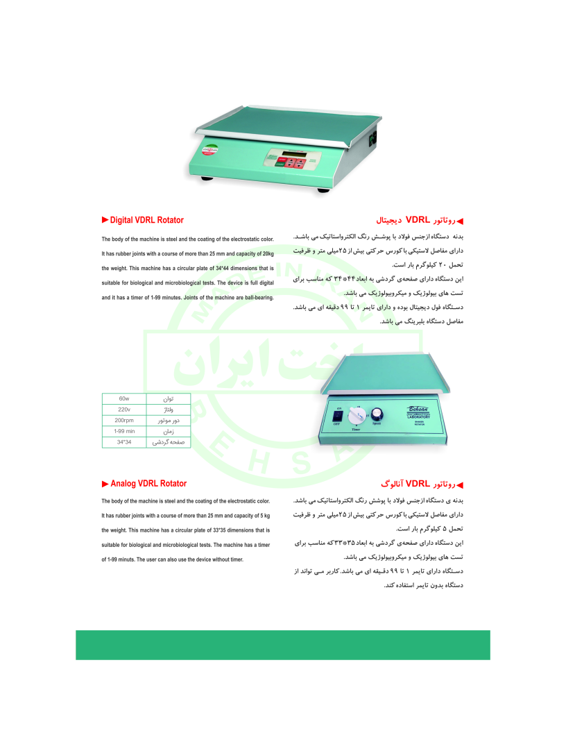 سلام روتاتور VDRL بهسان مدل آنالوگ رو از سایتتون خریداری کردیم. خداییش از نظر قدرت و کیفیت خیلی خوبه. فقط کاش مدل دیجیتال رو خریداری کرده بودم. اگر از نظر هزینه مشکلی ندارید پیشنهاد میکنم مدل دیجتالی رو خریداری کنید که موتور خیلی خیلی قوی تری داره و کنترل تایمی و میزان لرزشی بهتری دارید. ولی درکل میخواستم ازتون تشکر کنم . خیلی به موقع هم به دستمون رسید و بسته بندی مناسبی داشت.