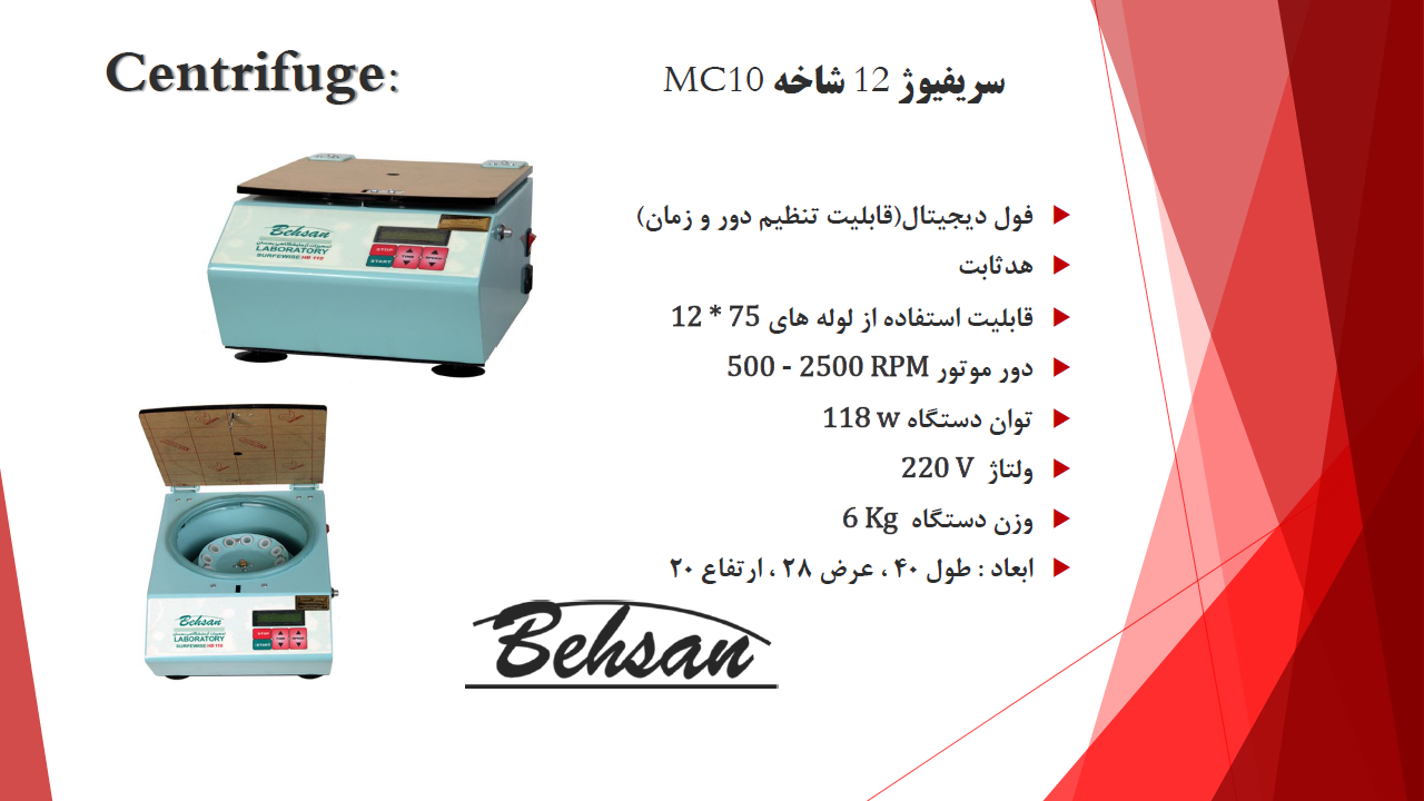 سروفیوژ نوعی سانتریفیوژ سایز کوچک بوده که اغلب برای سانتریفیوژ کردن لوله های گاما مورد استفاده قرار می گیرد. سریفیوژ شرکت بهسان به صورت 12 شاخه هد ثابت فول دیجیتال بوده و مشخصات فنی آن به شرح زیر است:
